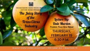 Feb 19 Texas Citrus Lecture Website Graphics (1920 x 1080 px) December 15, 2025 by Sarah Parker About Sarah Parker Previous Post:McFaddin-Ward House Museum Lecture Series Presents “The Juicy Story of the Texas Citrus Industry: Proud Past, Today’s Reality, Promising Future” By Dale Murden