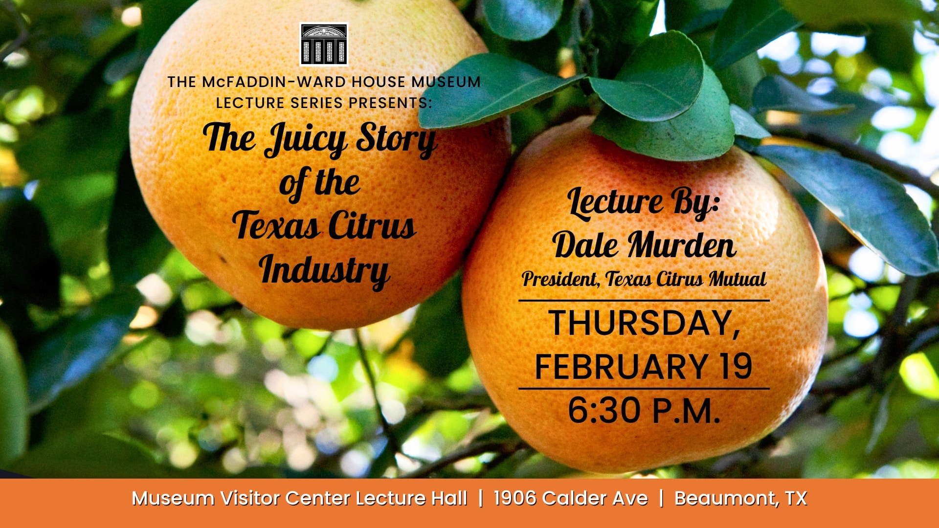 McFaddin-Ward House Visitor Center 1906 Calder, Beaumont, TX, United StatesJoin the McFaddin-Ward House Museum for “The Juicy Story of the Texas Citrus Industry,” a free public lecture presented by Dale Murden on Thursday, February 19, at 6:30 p.m. in …
