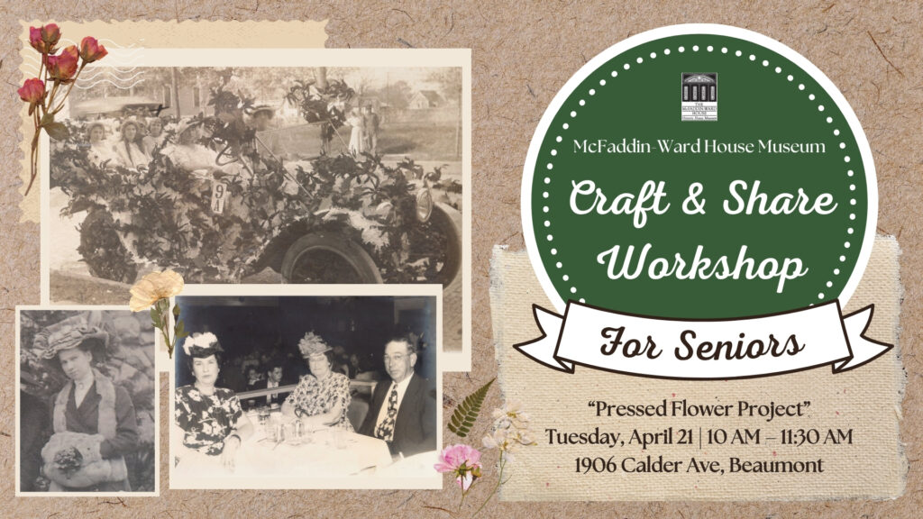 The McFaddin-Ward House Museum invites senior adults (65+) to join in our “Pressed Flower Project” Craft & Share Workshop on Tuesday, April 21, from 10 to 11:30 a.m. in the …