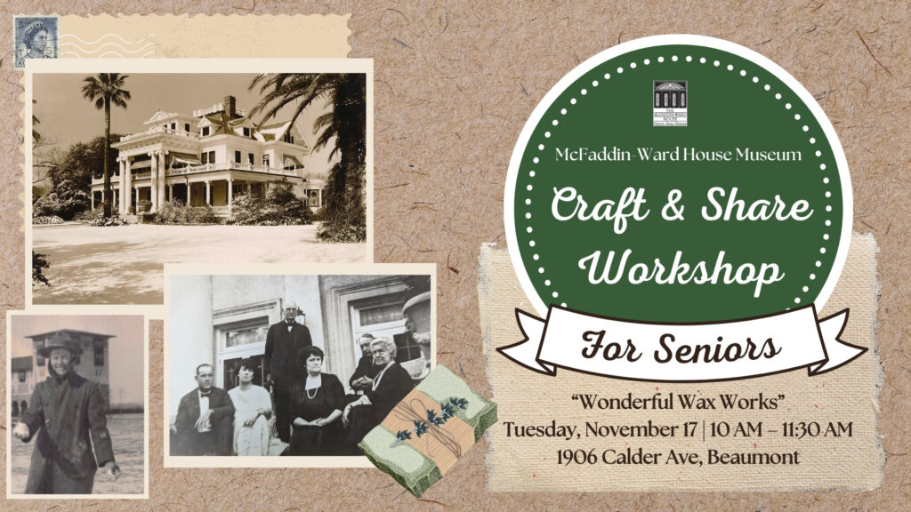 The McFaddin-Ward House Museum invites senior adults (65+) to join in our “Wonderful Wax Works” Craft & Share Workshop on Tuesday, November 17, from 10 to 11:30 a.m. in the …