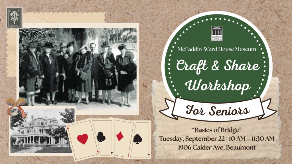 The McFaddin-Ward House Museum invites senior adults (65+) to join in our “Basics of Bridge” Craft & Share Workshop on Tuesday, September 22, from 10 to 11:30 a.m. in the …